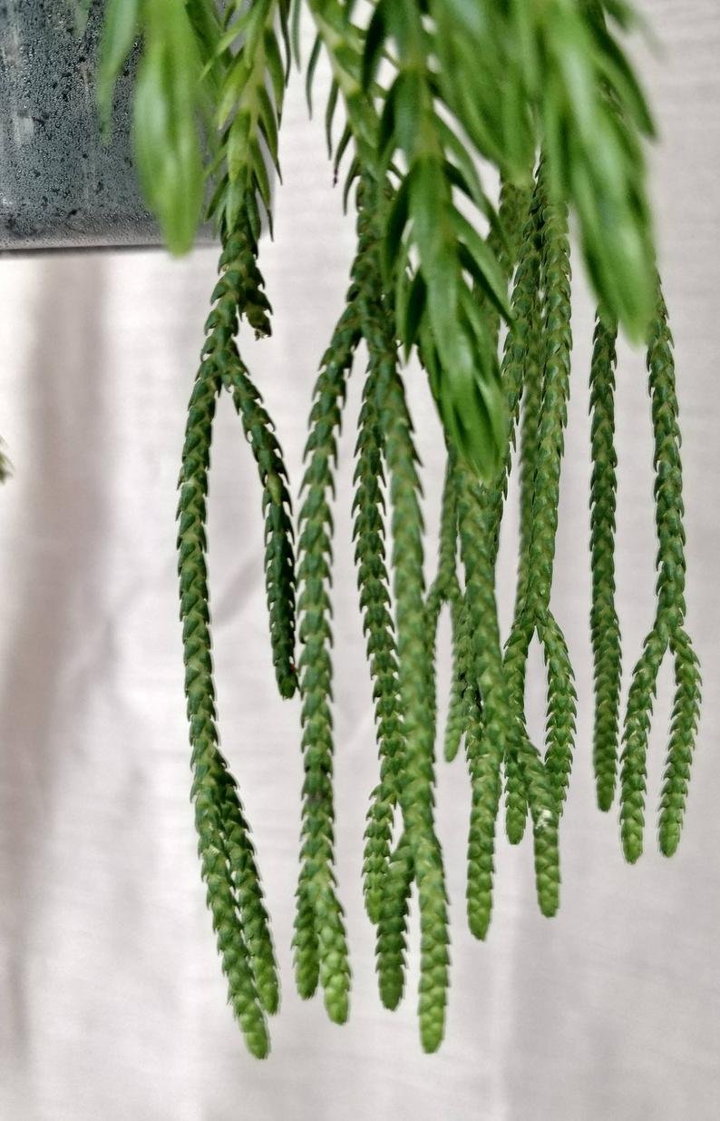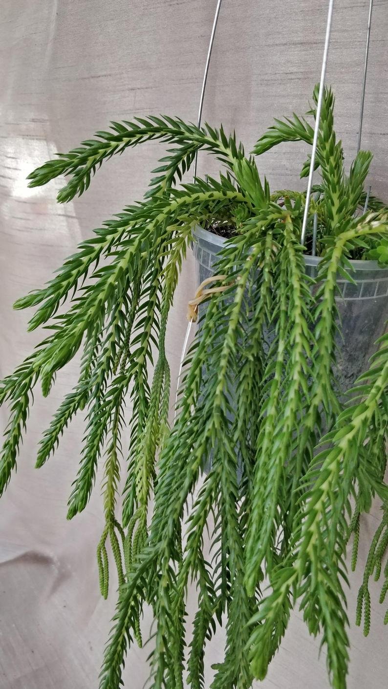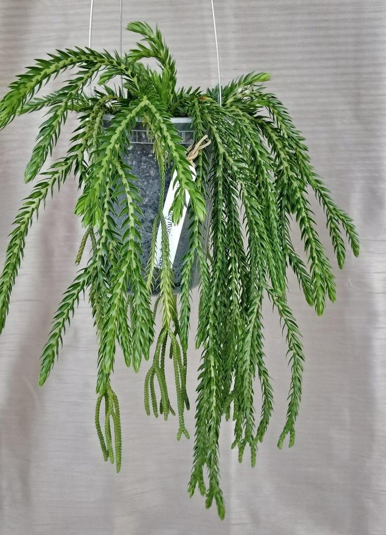 Huperzia Phlegmaria has tiny leaves growing on forked stems which can be as long as 80 cm. The stems grow from a single point from where they hang down towards the ground. This species is an epiphyte that normally grows on trees in its natural habitat so is ideally suited to cultivation in a hanging pot.
